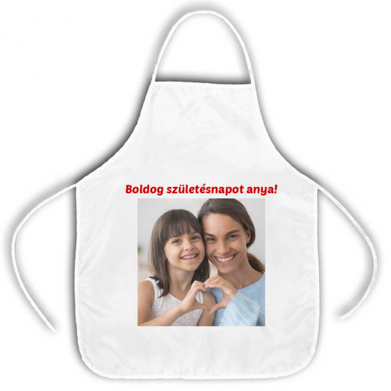 A szatén anyagból készült fehér kötényre 35X40 cm-ben kerül az Ön által elküldött színes nyomat, amely kiváló minőségének köszönhetően többszöri mosás után sem fakul ki.